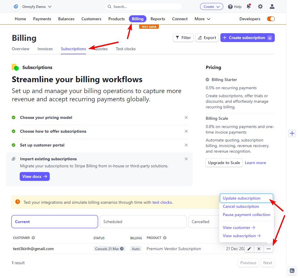 Navigate to Billing > Subscriptions from the top menu tabs. Find the customer (vendor) and select the 3 dots ( ... ) and choose Update Subscription.