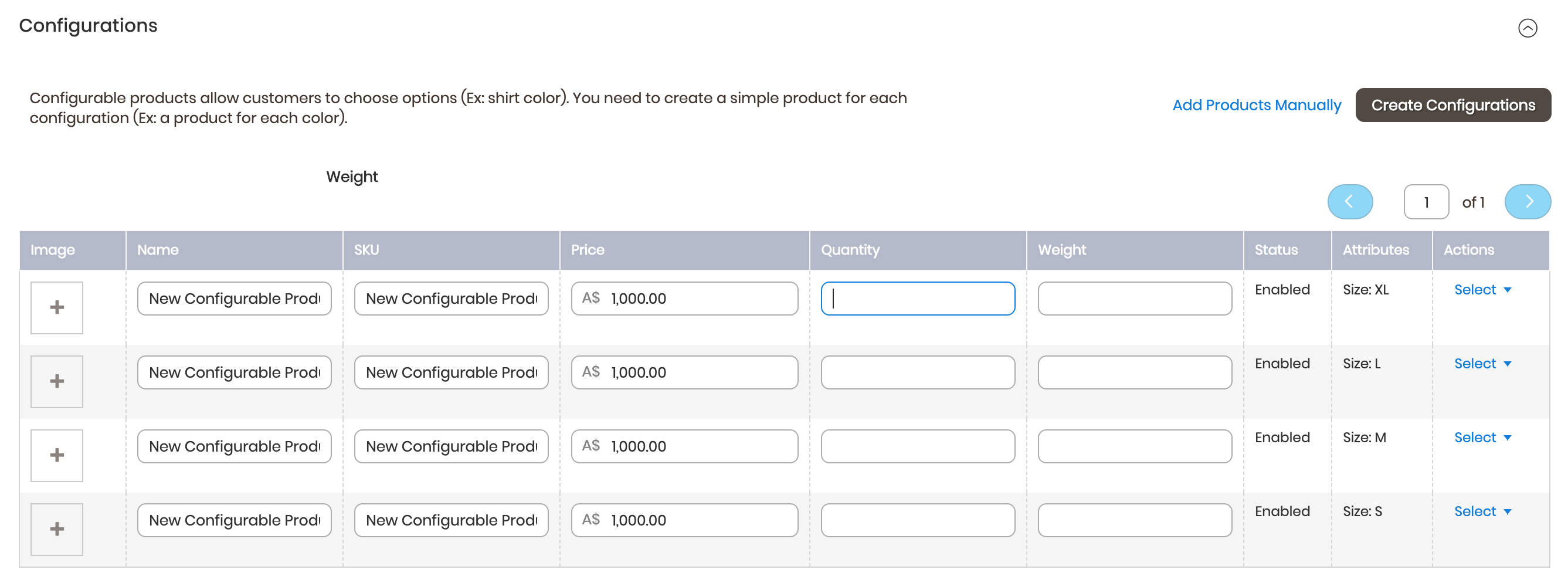 The Catalog will open a list of all the products available. To create a new one, choose the Configurable Product option, near Add Product.