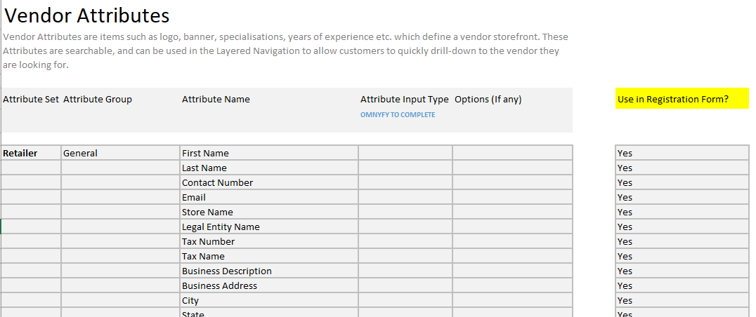 Attribute Group | In the same way as Product Attribute Groups, you can also group Vendor Attributes together for when the Vendors need to manage the Vendor Storefront from the back end admin. |